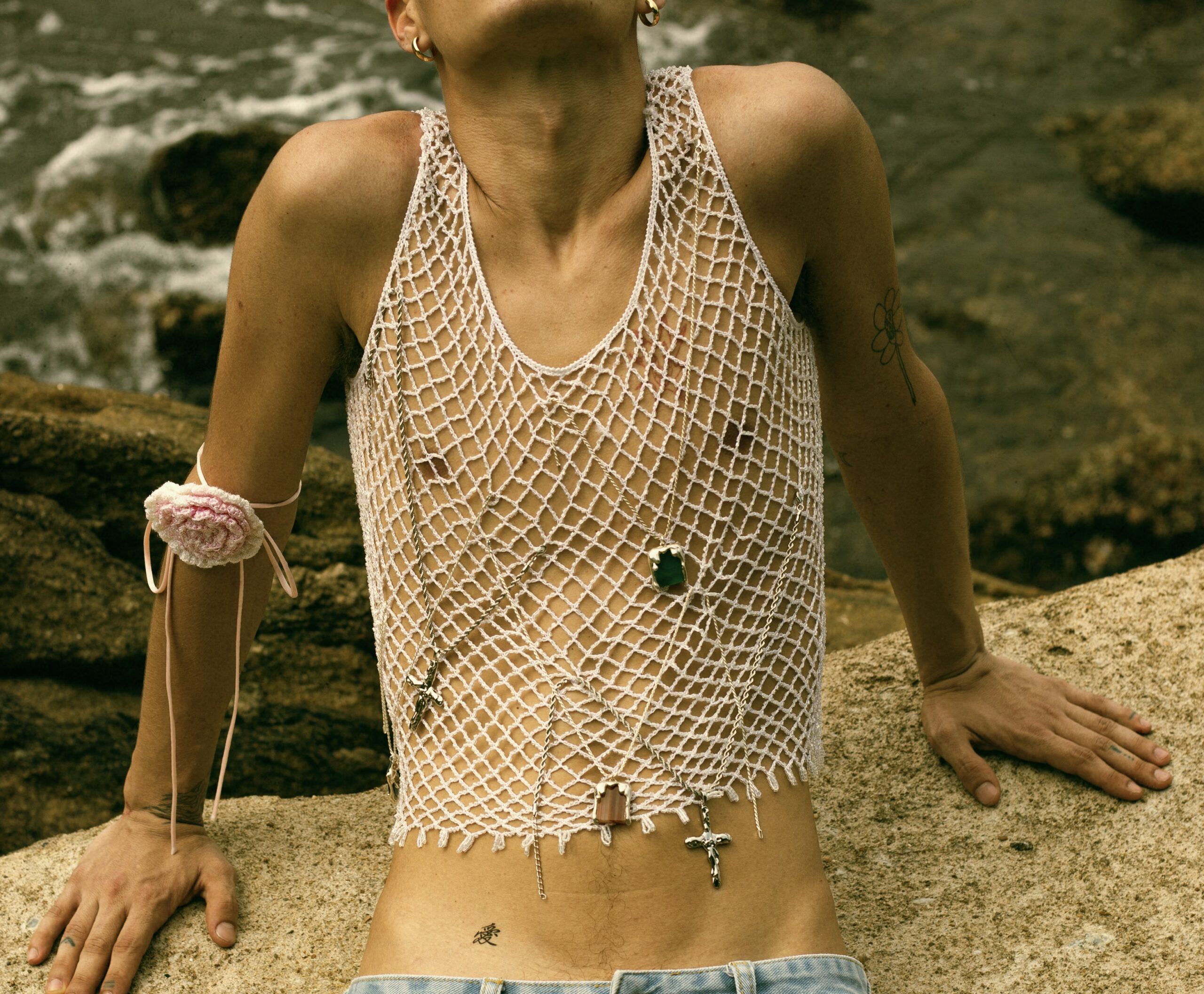 A minha maior influência em estética com certeza é a minha vó porque ela é bem parecida comigo, não consegue fazer nada perfeito. Mas ela faz do jeitinho dela e no fim fica tudo lindo. Minha avó borda colchas, painéis, toalhas… Outra coisa que me influencia são as formas que eu vejo na natureza e seus elementos, principalmente a água.