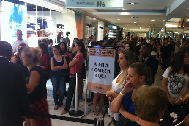 A primeira Forever 21 no Brasil abriu neste sábado (15.03), em São Paulo, com uma grande oferta de produtos que acompanham as principais tendências da moda, a preços bem convidativos. Muitas pessoas chegaram ao Morumbi Shopping antes mesmo da abertura das lojas (às 10h) para garantir os primeiros lugares na fila. Como o contingente de pessoas era muito grande, os consumidores foram divididos em três grupos: um em frente à loja e outros dois na área central do shopping. Somando, havia cerca de mil pessoas, número que se manteve estável até o fim da tarde, quando a loja demarcou o limite da fila que entraria na loja ainda no sábado e anunciou que abriria as portas novamente às 10h neste domingo.