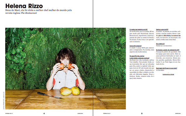 Um dos especiais desta edição mostra o que 22 criativos enxergam e vivem em São Paulo hoje. Entre os fotografados, estão a chef Helena Rizzo, os meninos do projeto Selvagem, Bia Granja, do youPIX, o fotógrafo Felipe Morozini, a curadora Maria Montero e o agitador cultural (e diretor do Mis e do Belas Artes) André Sturm, entre outros nomes que fazem o pulso da cidade bater sempre forte. As fotos são do jovem Eudes de Santana