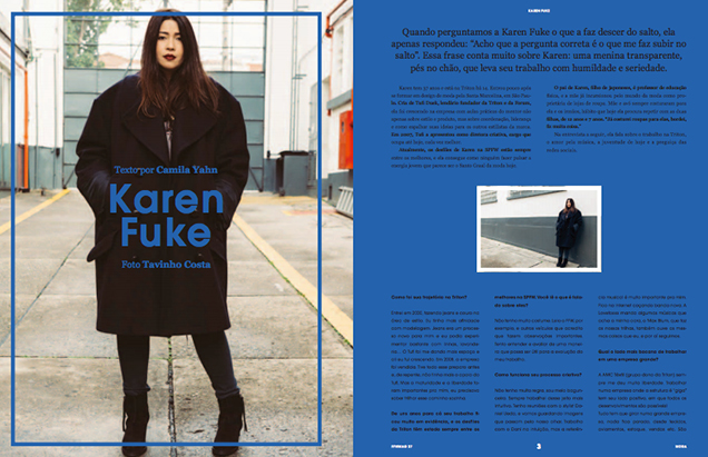 Karen Fuke, diretora criativa da Triton, também não poderia ficar de fora do nosso caderno de entrevistas. Karen é hoje uma das estilistas mais celebradas por seu trabalho jovem e vibrante frente à Triton