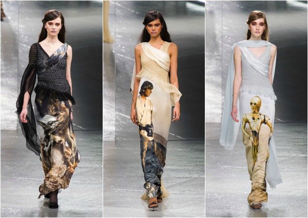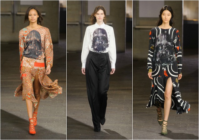 Mas é 2014 que promete ser o ano de “Star Wars” na moda. Apenas na temporada de Inverno 2014, duas grifes de peso trouxeram ícones da saga para as passarelas. Enquanto a Rodarte, comandada pelas irmãs Mulleavy, apostou em longos vestidos adornados por estampas de personagens como Yoda, Luke Skywalker e C-3PO, a inglesa Preen investiu no “dark side of the Force”. O sombrio Darth Vader apareceu em camisas, vestidos e camisetas criados pelo duo de estilistas Justin Thornton e Thea Bregazzi durante a última edição da Semana de Moda de Londres.