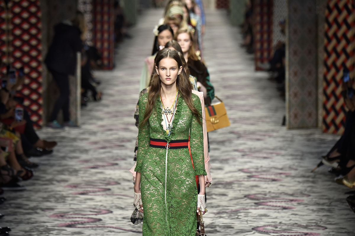 A coleção, assinada por Alessandro Michele, continuará imprimindo o estilo vintage decorativista intelectual do novo diretor criativo da marca e trará seus pássaros usados em outras ocasiões, além do neoprene em roupas, sapatos e outros acessórios. As reinterpretações da já clássica bolsa Dionysus e dos Ace Trainers estão entre as novidades. “Nosso cliente parece não se cansar de peças da Gucci”, afirma Alison.