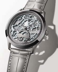 O Slim d’Hermès Squelette Lune contém duas versões distintas. A edição em platina se destaca por seu mostrador vazado em azul soleil vibrante. Enquanto a versão em titânio apresenta um mostrador antracito com acabamento soleil, complementado por uma luneta em DLC que se integra perfeitamente ao design.