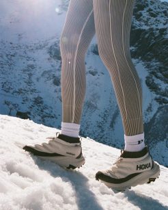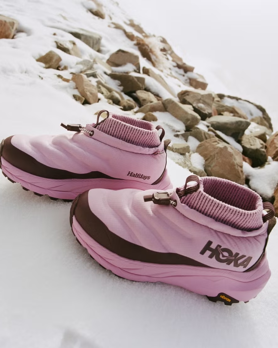 Com foco em ambientes montanhosos, a Hoka apostou em uma collab com a marca de esqui Halfdays para novos modelos