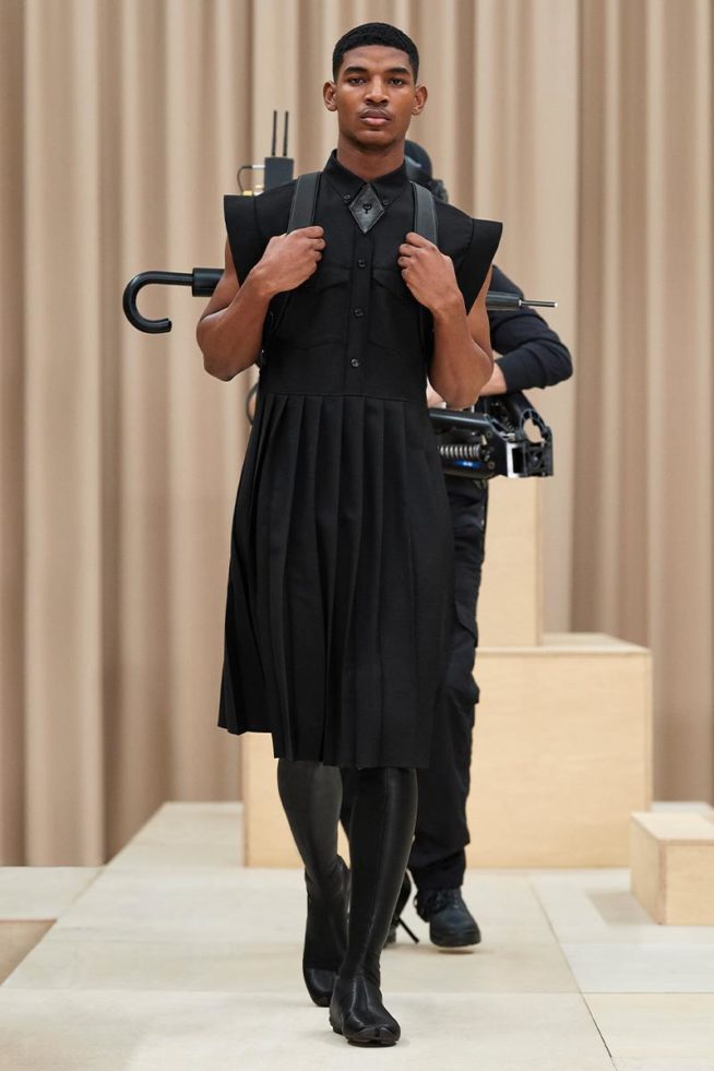 Marcas como Ludovic de Saint-Sernin (que tem o genderless em seu DNA), a Palomo Spain, Stefan Cooke e até Burberry, todas trouxeram saias em suas coleções. No Grammy 2021, o cantor e produtor porto-riquenho Bad Bunny, um dos mais populares artistas da atualidade, cruzou o tapete vermelho de saia da Burberry. E apesar de não ter sido dessa vez, Harry Styles também é outra figura que frequentemente utiliza peças “femininas” em suas produções.