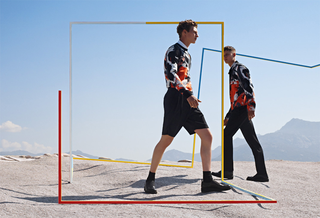 Dior Homme: imagens mais conceituais e artísticas para mostrar uma coleção um pouco futurista. Tim Schuhmacher & Florian Luger foram fotografados em Corisca por Karim Sadli. Quem assina a direção criativa é Kris Van Assche, que mistura a alfaiataria moderna com estampas que lembram as pinceladas de um artista que usa cores primárias. O resultado é uma imagem forte.