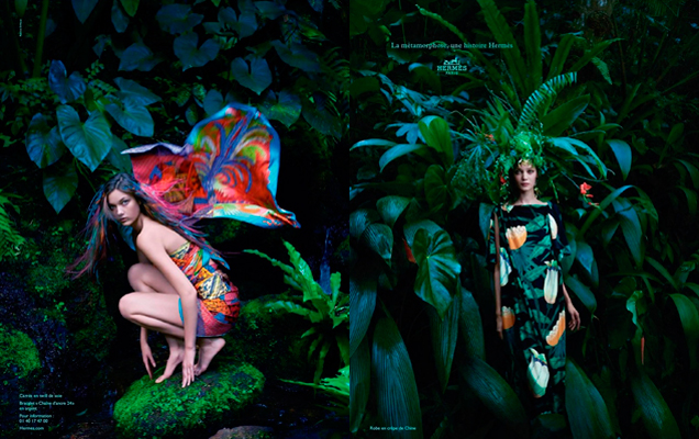 Hermès: a inspiração vem de metamorfose, mas parece ter se inspirado também na habilidade de alguns animais de se camuflarem e se mimetizarem. Se em uma imagem a modelo parece uma borboleta de cores tão vibrantes que só pode ter acabado de sair do casulo, em outra parece estar tão à vontade em meio à floresta que só pode pertencer a ela. As modelos Yumi Lambert (à esquerda) e Diana Moldovan (à direita) foram fotografadas por Hans Silvester.