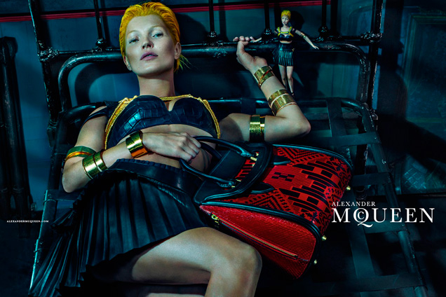 Alexander McQueen: Kate Moss posa pela primeira vez para uma campanha da grife. A inspiração vem do thriller cult dos anos 1960 “Peeping Tom”. Fotografada por Steven Klein, a modelo parece uma guerreira de cabelo joãozinho alaranjado, que contracena com uma boneca que é Kate em miniatura. As poses fortes evidenciam a mais recente linha de acessórios desenhada por Sarah Burton.