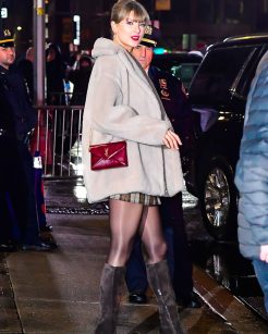 Antes de mudar para o vestido festivo dentro do estúdio, Swift chegou ao local vestindo uma versão mais apropriada para o inverno de seu estilo característico. O conjunto consistia em uma blusa cinza e um vestido-minis wrap em tons de cinza. Aliás, ela combinou a roupa com botas altas em camurça cinza da Christian Louboutin. Para enfrentar o frio da noite, a artista adicionou meia-calça preta e uma jaqueta falsa de pele creme.
