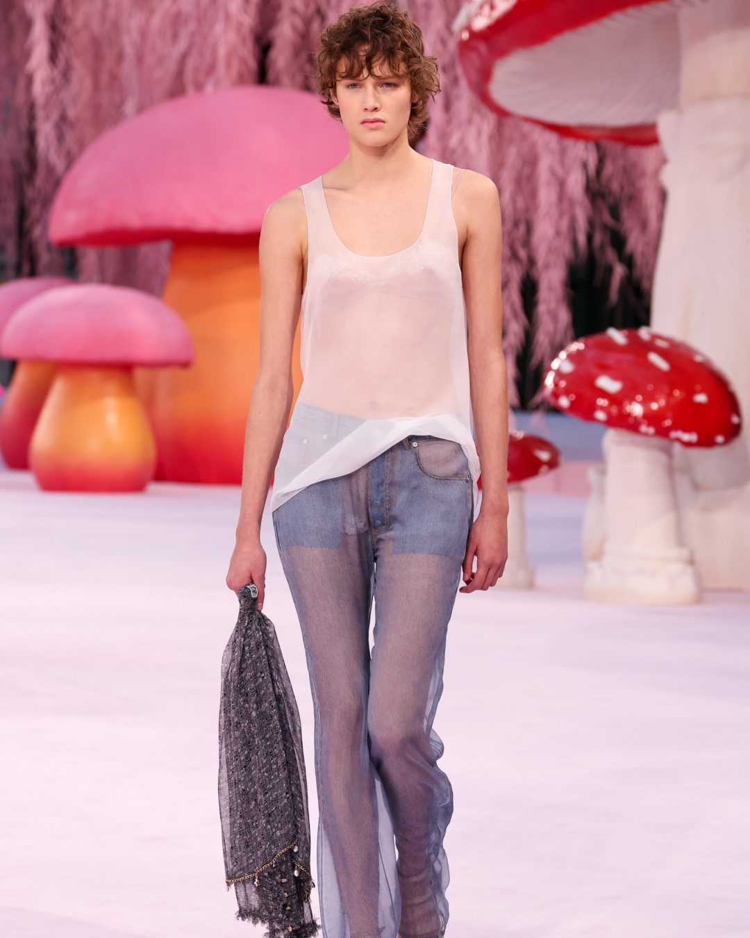 A modelagem é fiel ao clássico, com calça de corte reto e bolsos estrategicamente posicionados, mas em um material que remete ao denim, sem ser exatamente ele. A camisa, também confeccionada em seda, mantém a transparência sutil, criando uma aura de leveza. A regata de decote redondo e a calça jeans de seda azul e branca formam um conjunto que mistura casualidade com a elegância do savoir-faire da Chanel.