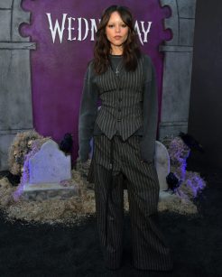 O conjunto remete diretamente ao uniforme da Wandinha Addams, mas com modernidade e conforto. Ao apostar em peças estruturadas e ao mesmo tempo fluidas, a atriz demonstra como é possível reinterpretar ícones da cultura pop sem perder a sofisticação.