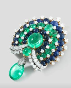 Recentemente, Paris se tornou o palco de um marco histórico no universo das vendas de joias, com uma impressionante spilla da marca Bulgari, anteriormente pertencente à icônica atriz Audrey Hepburn. Esta arrematada por 355.600 euros em um leilão promovido pela Sotheby’s. Este valor superou em muito a estimativa inicial que variava entre 40.000 e 60.000 euros. A peça em questão, confeccionada nos anos 60, conta com esmeraldas, safiras e diamantes. Destacando-se uma pedra verde em corte cabochon acompanhada por uma gota pendente de esmeralda.