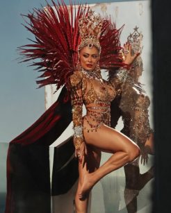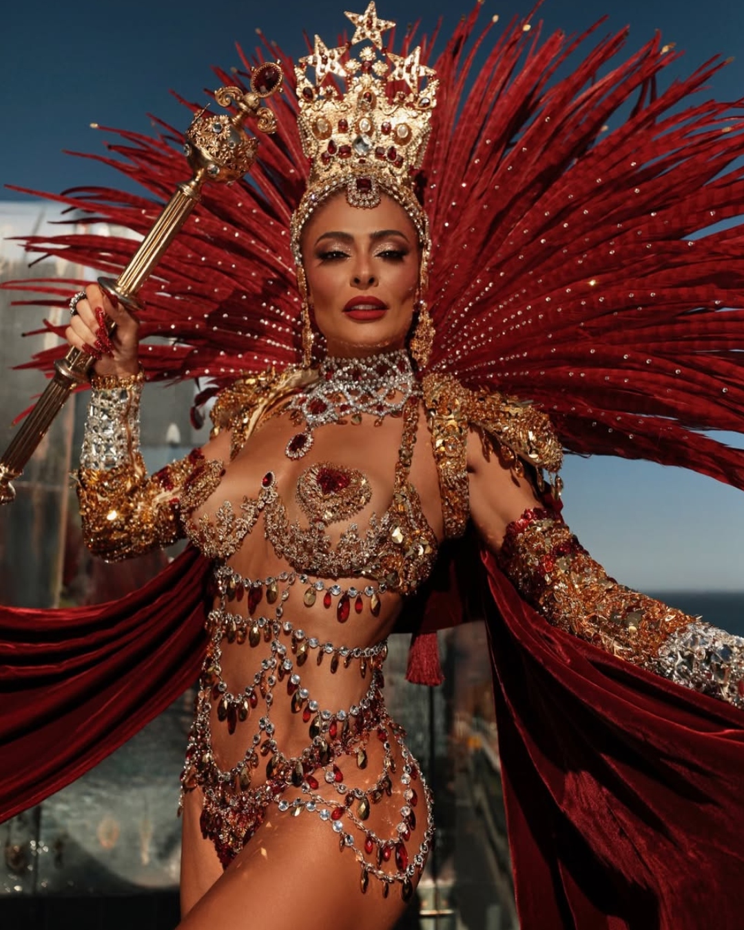 Juliana Paes marcou presença luminosa no Carnaval carioca ao assumir novamente o posto de rainha de bateria da Unidos do Viradouro com uma fantasia pensada para ser ao mesmo tempo impactante e sofisticada. A produção foi assinada pela grife italiana Dolce & Gabbana, reconhecida mundialmente por suas criações exuberantes e espírito mediterrâneo. Trazendo ao samba-enredo uma combinação de luxo e tradição popular.