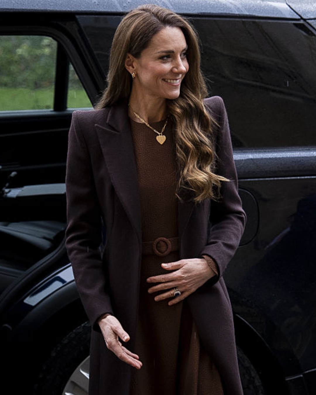 Para completar a composição, a princesa combinou o vestido com meia-calça marrom translúcida e escarpins de camurça em tonalidade semelhante. Ademais, a escolha dos acessórios também contribuiu para o equilíbrio entre clássico e atual: um colar com pingente em forma de coração em ouro. Tal estilo remete à estética Y2K, conferindo um toque romântico e leve ao visual. Além de fazer referência ao uso frequente de joias que geram simbolismo nas aparições públicas de Kate.