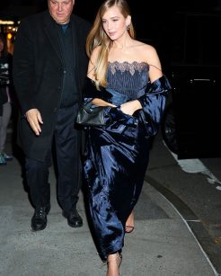 Já durante a festa após a estreia, Jennifer transformou seu estilo para se adequar ao clima noturno, escolhendo um visual azul-marinho da marca FFORME. O conjunto consistia em um vestido slip rendado e um trench coat combinando.