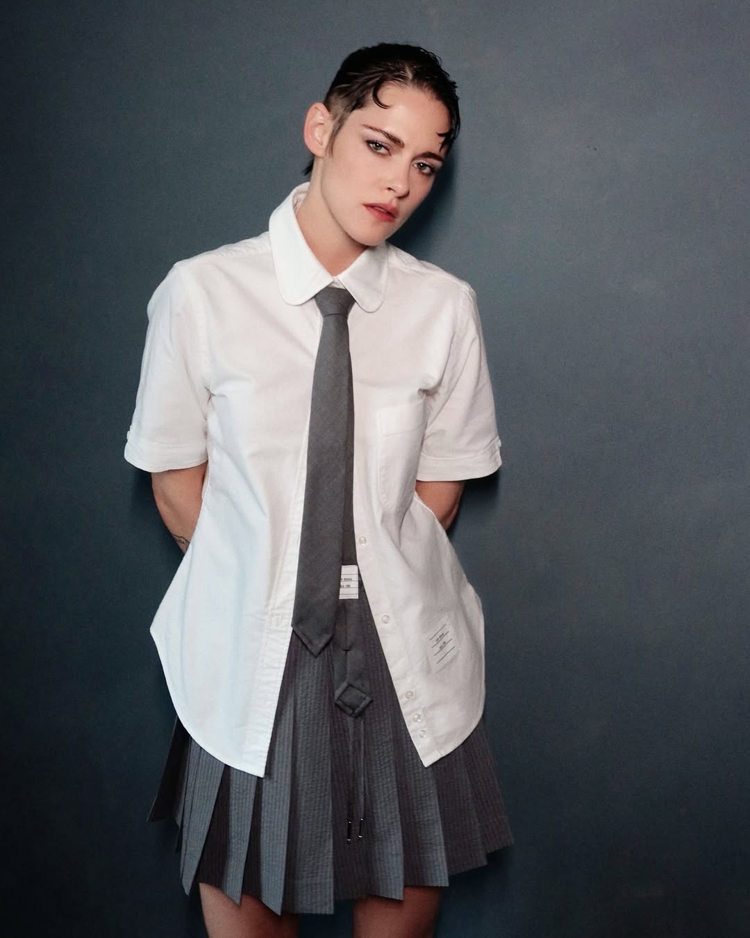 Em um estilo que remete à estética clássica de uniformes escolares da marca Thom Browne, Kristen não hesitou em adotar a proposta da grife. Ela vestiu uma camisa branca de mangas curtas, uma saia plissada cinza, gravata combinando, meias listradas e elegantes sapatos de salto alto. Essa combinação ousada e rebelde reflete perfeitamente sua personalidade autêntica. Destacando-se mais pela atitude do que por exageros na produção.
