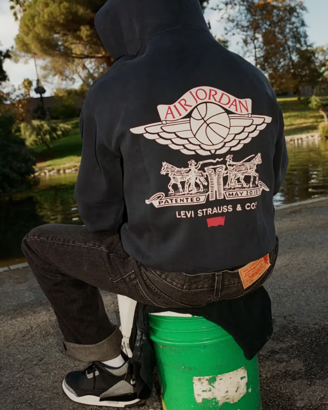 A série mergulha fundo na estética skate retrô, com cortes oversized que evocam o fim dos anos 1980 e começo dos 1990. No entanto, um dos maiores destaques é o moletom zip-up. Ele exibe um co-branding forte na parte traseira, unindo o logo Jordan Wings a um visual baseado no clássico patch de couro “two-horse” da Levi’s.