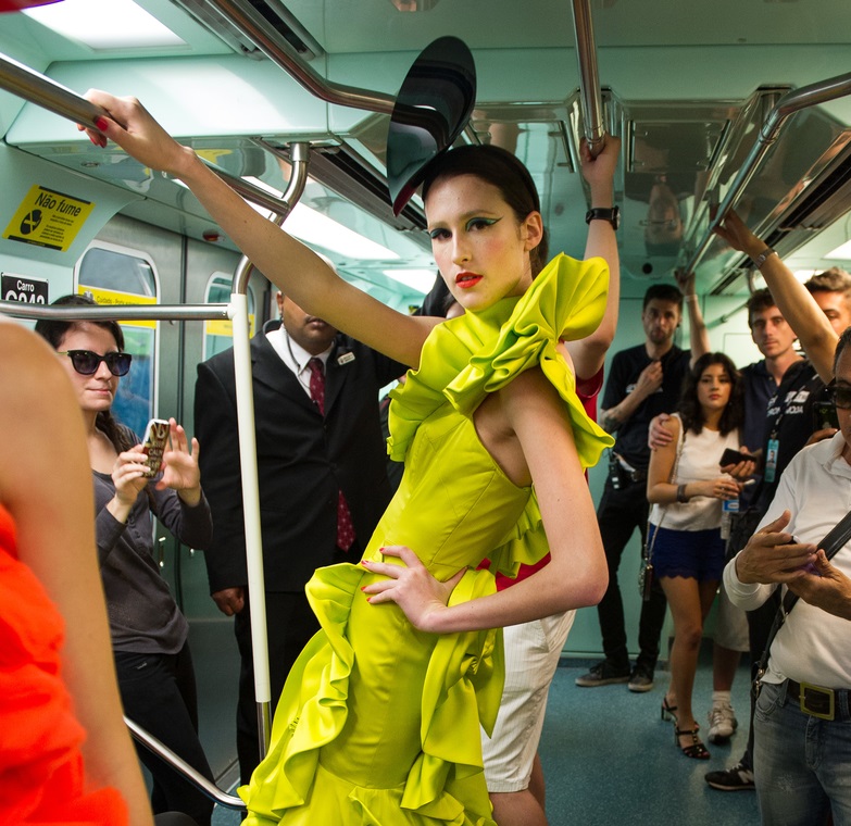 O #metronamoda aconteceu neste domingo (27.10) na linha 02, verde, do metrô de São Paulo. O evento, que abriu a agenda oficial da edição de Outono/Inverno 2014 do SPFW, começou na estação Vila Madalena, onde 40 modelos partiram em direção à Vila Prudente. Dezenas de pessoas, muitos estudantes de moda, inclusive, acompanharam o percurso, que teve trilha sonora de Gigi Suleiman, vencedora do Movimento HotSpot.