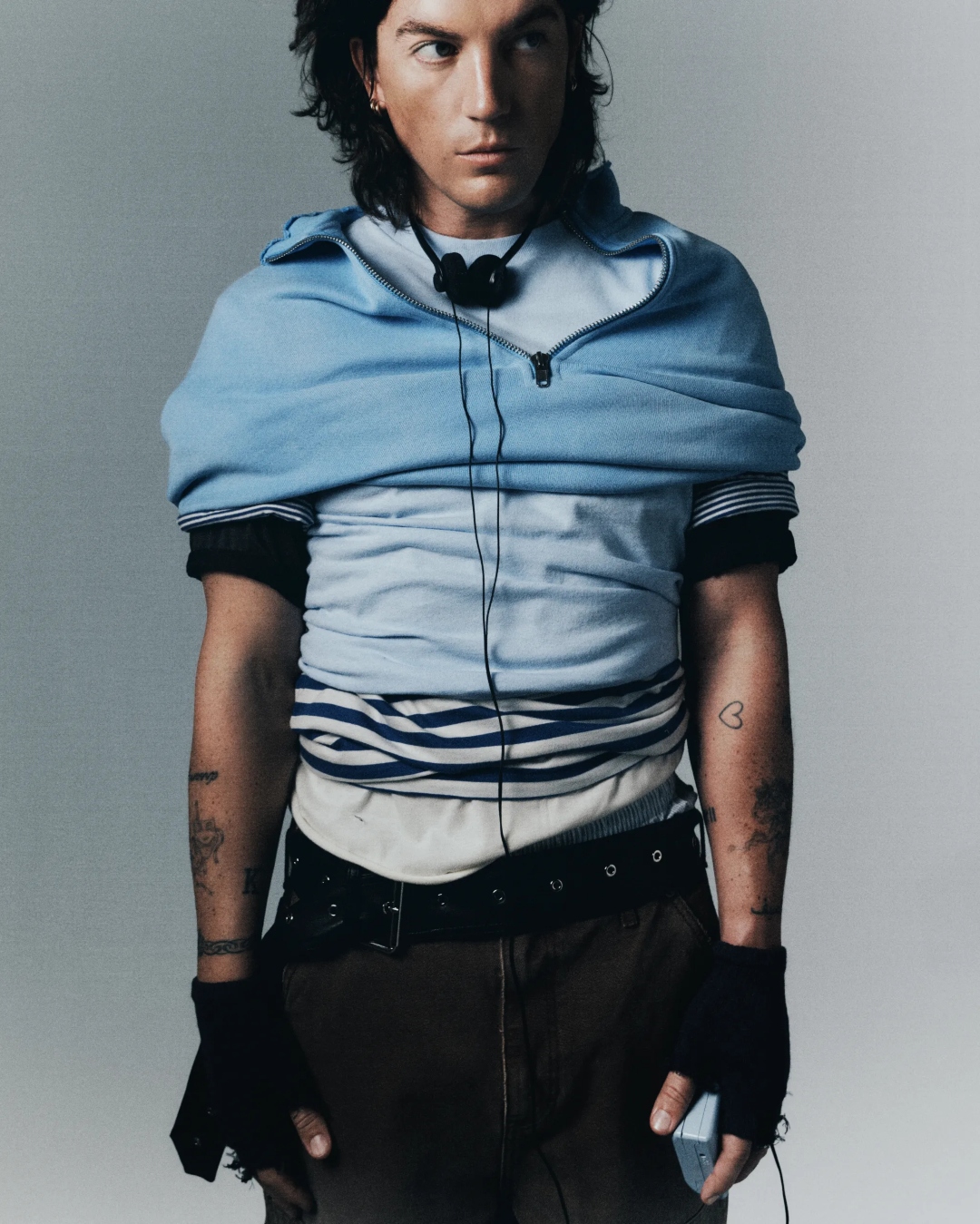 Por isso, junto com a Elwood, Klein criou uma coleção com camisetas, suéteres de tricô, uma jaqueta de couro e uma bolsa combinando. A ideia, aliás, era refletir o estilo próprio do cantor.
