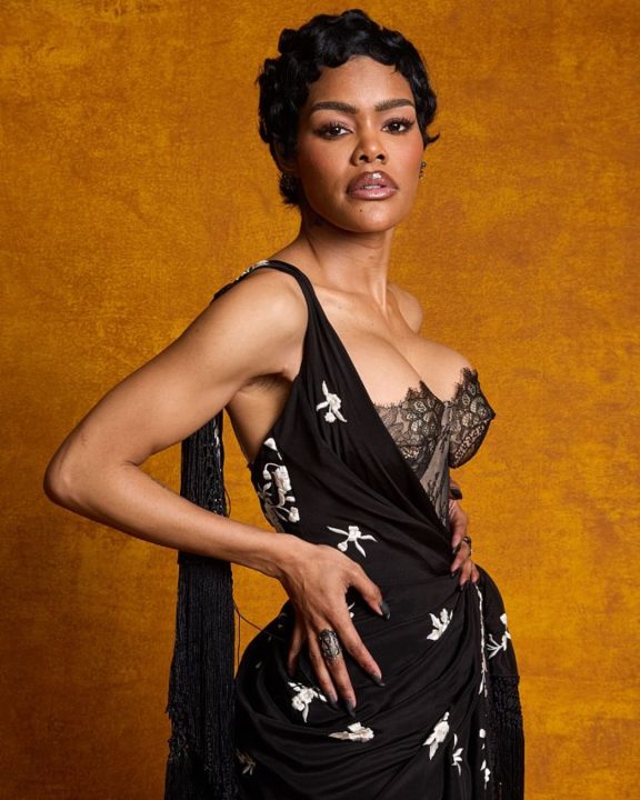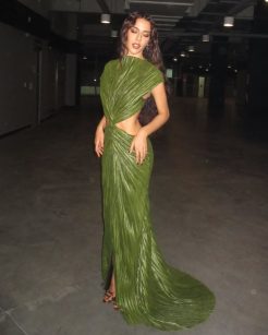 Por fim, Marina Sena trouxe um olhar mais conceitual ao apostar em um look da Cult Gaia em verde-musgo, com textura que remetia a folhagens. O vestido, marcado por decote profundo e abertura na cintura, dialogou diretamente com o universo estético de seu álbum “Coisas Naturais”.