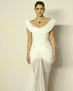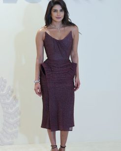 No evento de lançamento da nova exposição Bvlgari Serpenti Infinito, realizado em Mumbai, Índia, Priyanka Chopra Jonas chamou a atenção ao se apresentar com um visual deslumbrante, repleto de brilho. A atriz e produtora, que é embaixadora da marca de luxo, fez sua entrada triunfal vestindo um elegante vestido burgundy desenhado pela grife australiana Maticevski.