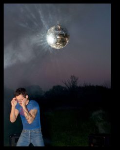 A imagem, impactante, não apenas destaca o cantor e a enorme bola de discoteca que flutua no cenário. No entanto, também a camiseta azul que exibe o título do álbum em vermelho.