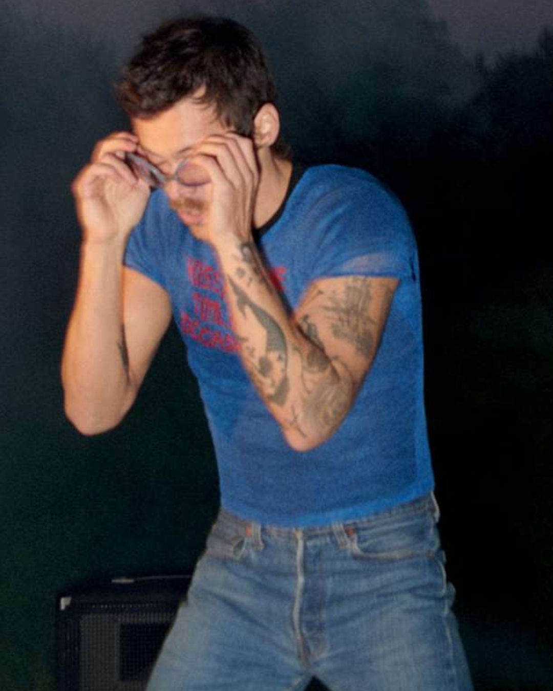 Ao contrário de muitos artistas têxteis, Carroll opta por técnicas simples devido ao seu aprendizado autodidata: frequentemente utiliza um calibre mais largo do que o habitual. Uma escolha quase acidental que permitiu experimentar com transparências, texturas e tipografia. Ademais, a frase “Kiss All The Time. Disco, Occasionally” está perfeitamente alinhada com a estética e sensibilidade de Harry Styles. Sempre atento à conceitualização do que veste.