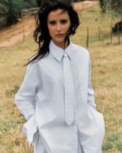 A paleta de cores neutras — preto, branco, cinza, azul claro e off white — seguida por tecidos como por exemplo, tricoline, jeans, sarja e renda, com muita textura e movimento. E claro, o destaque fica com a icônica baby tee com a palavra “Brasil”, que estampa o orgulho pela identidade nacional.