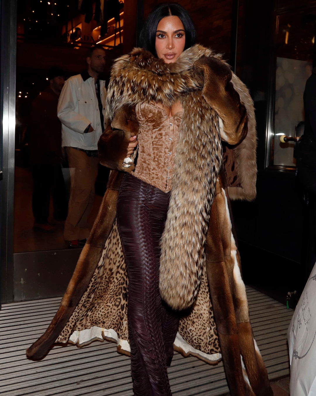 No entanto, apesar do frio, Kim Kardashian usou um corset de veludo. Além disso, escolheu também calças de couro flare feitas de tiras entrelaçadas de couro cor berinjela da coleção Primavera 2024. Para completar o visual, ela também apostou em uma estola de pele.