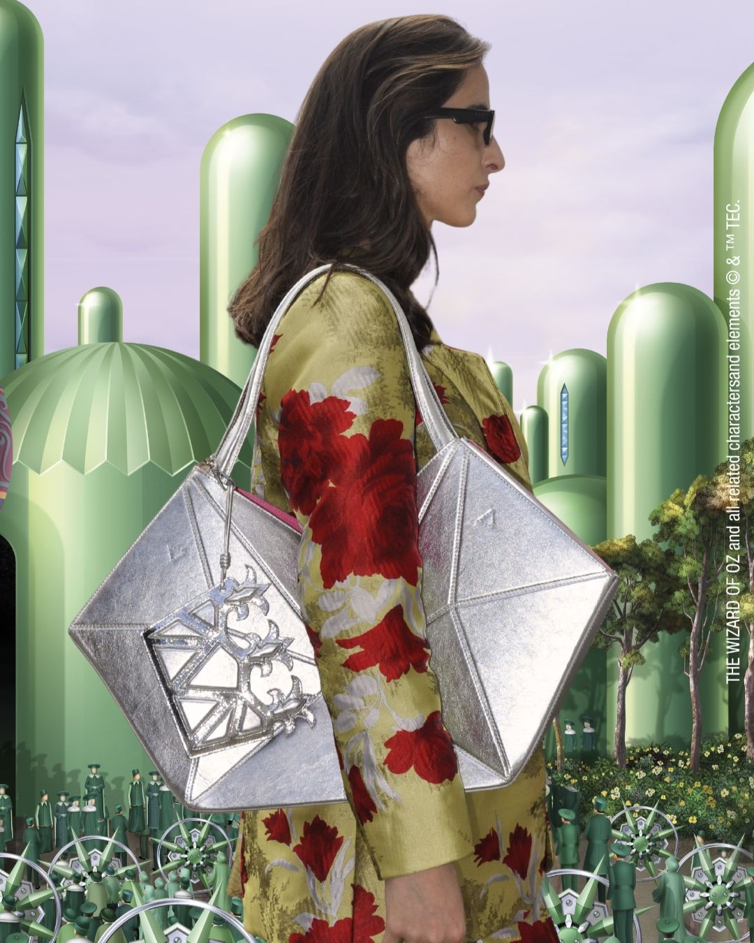 Aliás, outros modelos evocam elementos icônicos do longa-metragem, como uma bolsa em formato de televisão vintage com cenas do filme. Ademais, há uma peça dupla-face que une o coração do Homem de Lata ao relógio de contagem do tempo. Também tem um modelo em forma de livro inspirado na obra original.