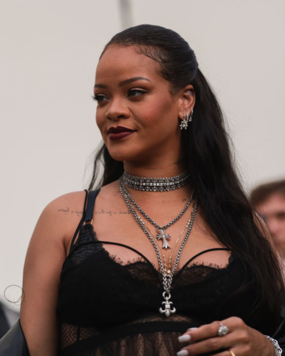 No dia anterior, Rihanna marcou presença na estreia da alta-costura de Jonathan Anderson para a Dior. Em outro momento do evento, ela surgiu usando acessórios florais inspirados no desfile, combinando-os com jeans, uma camiseta branca e sapatos de salto pontudo em tom marfim.