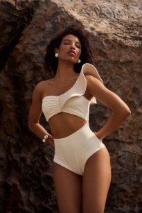 Julia Fantin, natural de Florianópolis, propõe beachwear consciente e sustentável, transformando sobras de tecido em novas peças com modelagens especiais. Sua marca aposta em técnicas manuais e upcycling, criando biquínis e peças estruturadas em matelassê que celebram a singularidade dos corpos femininos.