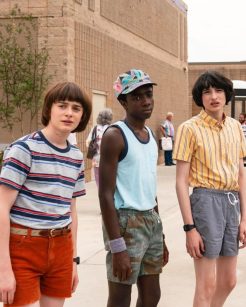 Ademais, as listras também ocupam lugar de destaque. Presente em camisetas, polos e suéteres, a padronagem acompanha momentos emblemáticos de personagens como Max e Will, reforçando seu caráter atemporal dentro do vestuário.