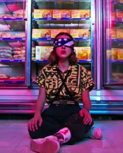 Finalizando, o scrunchie, famoso elástico de tecido, marca presença entre as personagens femininas, adicionando charme e reforçando o espírito exagerado e divertido dos anos 80.
