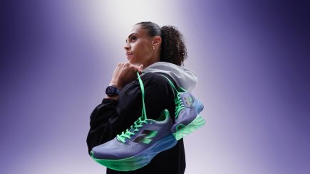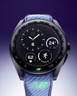 Paralelamente, a New Balance destaca seu novo modelo de tênis de corrida, o FuelCell SC Elite v5, descrito como o produto mais leve e de maior desempenho até hoje da marca. Com cores que remetem à colaboração, verde e roxo, o tênis também incorpora o escudo da Tag Heuer em seu design.