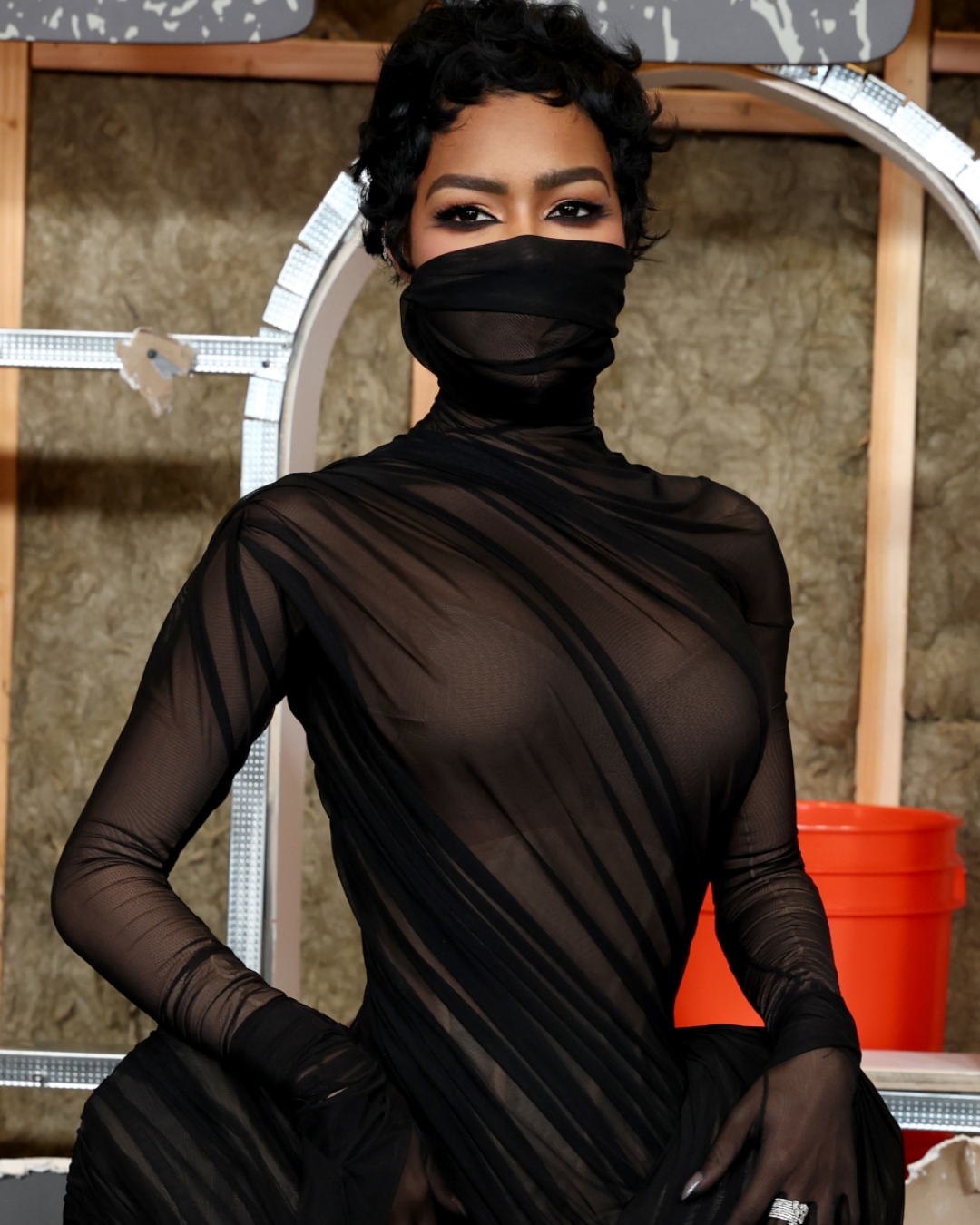 A peça ainda conta com uma gola alta puxada sobre o rosto, que foi o detalhe principal do vestido. Isso trouxe o contexto do filme, que pareceriam em sintonia com o look de Teyana Taylor. Por fim, para completar o visual, a artista usou joias da Spinelli Kilcollin e da Repossi.