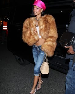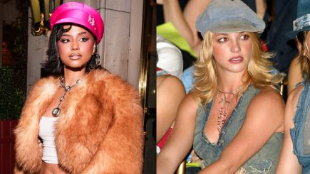 Aliás, ela claramente se inspirou no estilo icônico de Britney Spears em uma produção “mais é mais” que uniu diferentes texturas, cores e proporções. O visual foi construído com um casaco de pele oversized e felpudo sobreposto a uma regata branca canelada.