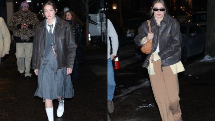 Desta vez, ela apostou na jaqueta marrom escuro com acabamento desgastado em dois looks de inverno em Nova York. No primeiro momento, ela foi flagrada durante as filmagens de conteúdo para a GQ e Thom Browne e escolheu um estilo mais descolado. Para isso, usou a peça chave com um dos uniformes icônicos do estilista, de acordo com a Harper’s Bazaar US.