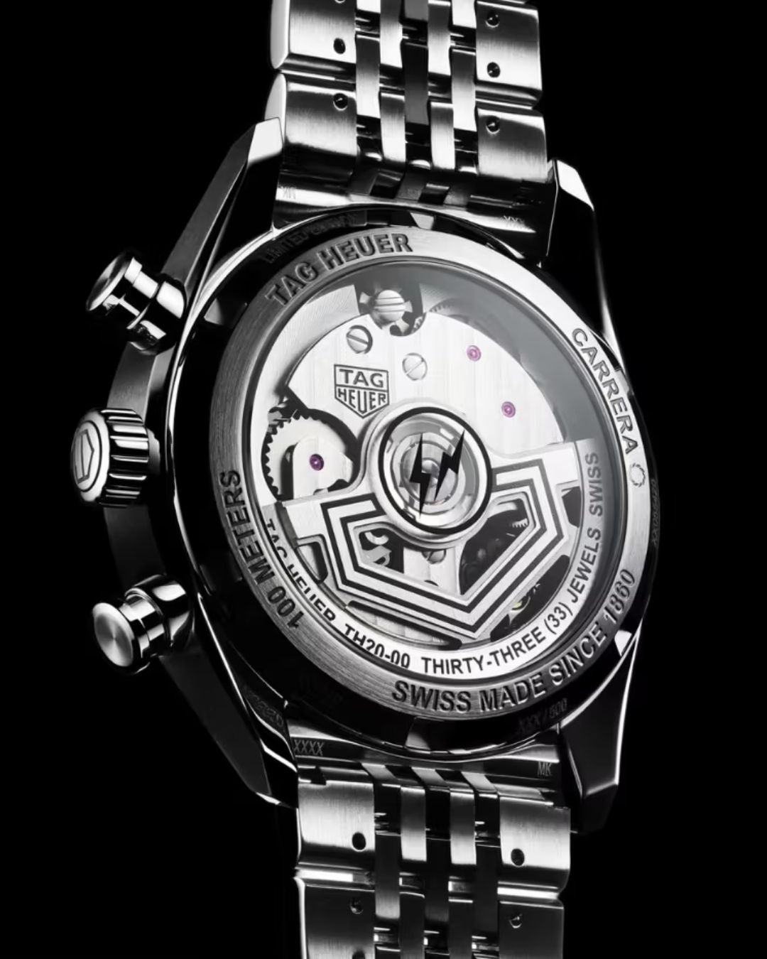 No aspecto técnico, o Carrera Chronograph x fragment Limited Edition contém o movimento automático Calibre TH20-00 da TAG Heuer. Este oferece uma reserva de marcha impressionante de 80 horas. O fundo em safira permite a visualização da roda de colunas e da embreagem vertical do movimento. Além de exibir uma gravação em forma de Victory Wreath, uma homenagem à tradição de Jack Heuer. Ele presenteava pilotos vencedores da Fórmula 1 com relógios exclusivos. O logo da fragment está delicadamente aplicado no cristal, reforçando a identidade desta colaboração especial.