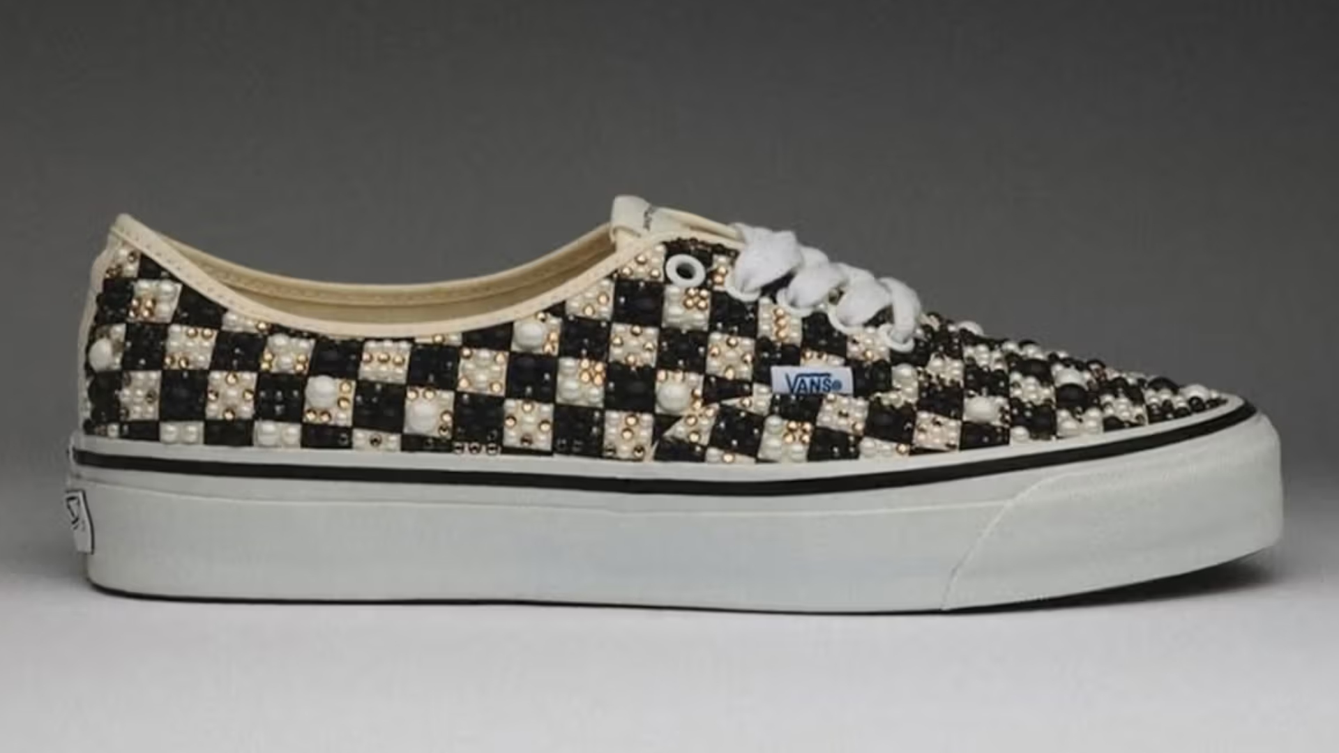 Esta versão modernizada do Authentic se inspira no icônico padrão Checkboard da Vans. O novo design apresenta uma base de quadros brancos, meticulosamente adornados com miçangas em tonalidades peroladas e douradas, dispostas em diversos tamanhos.