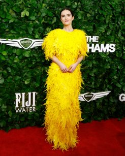 Por fim, Zoey Deutch compareceu ao Gotham Film Awards de 2025 com um vestido Prada. O modelo, que imitava penas, é confeccionado com lantejoulas cortadas para imitar penas de avestruz. Criando textura e dando um certo volume, mas sem uma única pluma à vista. A peça, combinava cores vibrantes, superfície escultural e uma silhueta, que foge totalmente da fórmula típica de cetim tecnológico e cortes retos da maison, deixando a produção ainda mais ousada e autêntica.