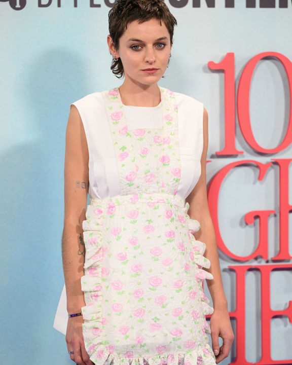 Emma Corrin usa avental recém-saído da nova coleção da Miu Miu durante evento em Londres